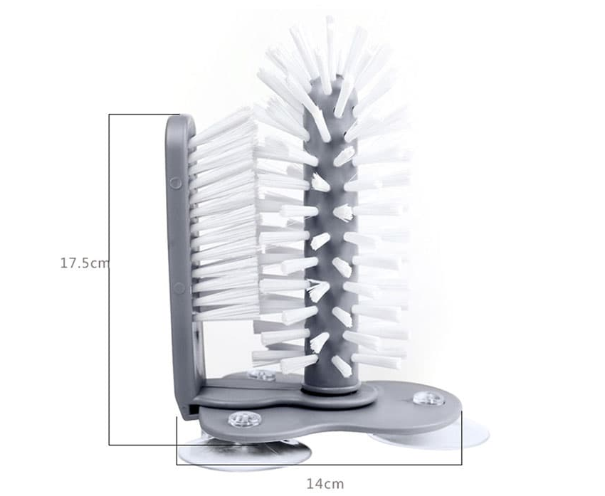 Ця двостороння щетинна щітка з присоском для фіксації виробу на місці та запобігання ковзанню під час використання, що гарантує максимальну безпеку під час очищення виробів зі скла. Ефективно очищає помаду від слідів та інших стійких і глибоких плям і слідів. Жорсткі полівінілхлоридні волокна використовуються для глибокого проникнення, а дві щітки для очищення всередині, як і зовні склянок і чашок одночасно.