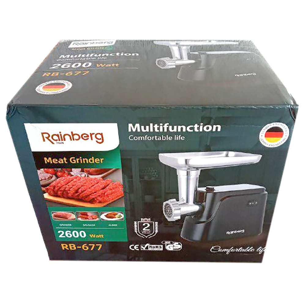 Електром’ясорубка Rainberg — новинка від виробника Rainberg. Це компактна та продуктивна електрична шнекова м’ясорубка з функціями реверсу та заглушення шуму від надійного та перевіреного виробника. Завдяки своїм компактним розмірам вона не займе багато місця на кухні. М’ясорубка Rainberg — чудовий вибір, якщо вам потрібно швидко зробити фарш. З допомогою насадки для ковбас, Ви зможете зробити домашні ковбаски власного приготування. Функція зворотного обертання ножів (реверс) допоможе вам, якщо всередині приладу створився ущільнення з продуктів.