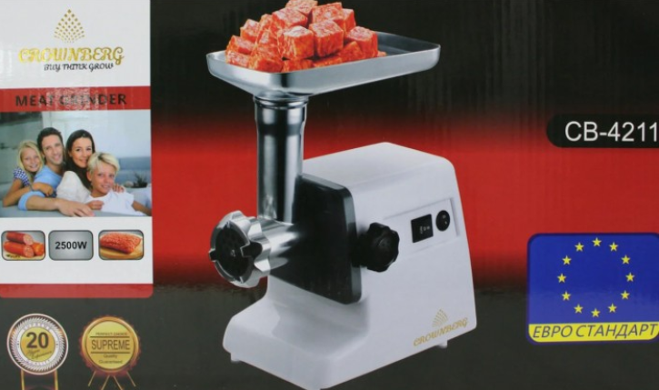 Crownberg — це якісна м’ясорубка, виготовлена з якісного пластику з гострими ножами з нержавіючої сталі. На нижній частині м’ясорубки встановлені якісні гумові ніжки для уникнення ковзання. Прилад обладнаний двигуном 2500 Вт із захистом від перевантаження.