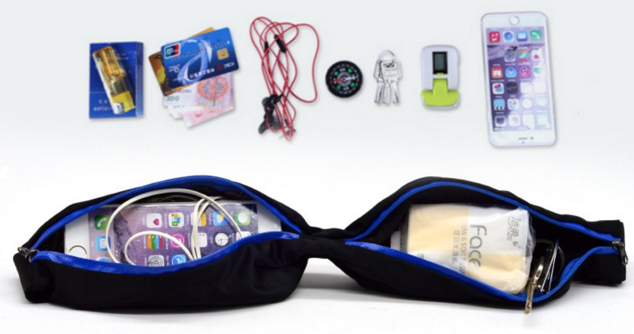Пояс має 2 місткі кишені на водонепроникній блискавці. У них можна розмістити — телефон (до 5″, 16 см х 8 см), ключі, MP3-плеєр, гроші, серветки, інше;
