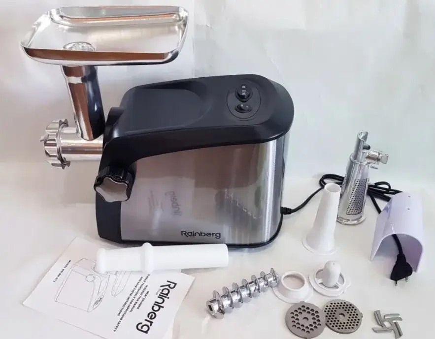 Електром’ясорубка комбайн. Електрична м’ясорубка Rainberg Потужність 3000 Ват призначена для виготовлення фаршу з м’яса, риби, грибів, нарізки овочів і фруктів, профілювання пісочного і пельменного тіста. Тип м’ясорубки — шнековий. Дана модель забезпечена функцією “реверс”: для запобігання ущільнення продуктів всередині м’ясорубки передбачений режим зворотного обертання шнека. Корпус м’ясорубки виготовлений з міцного пластику, на нижній частині корпусу розташовані гумові ніжки для додаткової стійкості. Потужність двигуна 3000Вт. 2 гострих ножі з нержавіючої сталі. Головка корпусу з алюмінію. Набір решіток для приготування фаршу. Низький рівень шуму. Хрестоподібний ніж з нержавіючої сталі.