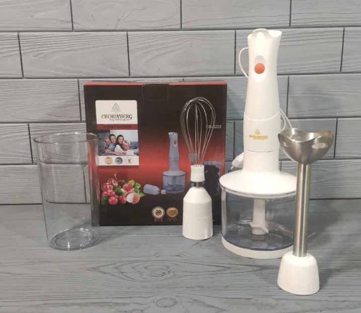 Це побутовий прилад, який спеціалізується на подрібненні та збиванні продуктів. Без зайвих грудочок, він легко і швидко перетре варені овочі, подрібнить будь-які види горіхів або зробить об’ємну білкову масу. Блендер Crownberg – справжній агрегат, який виконує безліч функцій, завдяки змінним насадкам. Що входить в комплект вінчик дозволяє змішувати рідкі продукти, збивати коктейлі, безе і легкі муси. Приготувати дитяче пюре з варених овочів і фруктів допоможе спеціальна насадка для пюре, а стандартна блендерна насадка ефективно справляється зі змішуванням і збиванням супів-пюре, однорідних соусів і підлив, а також коктейлів. Блендер має компактні розміри, але при цьому володіє хорошою потужністю в 300 Вт. Крім моторної частини в комплекті є кілька насадок, чаша для подрібнення овочів. Ріжучі деталі подрібнювача, вінчик і занурювальна частина блендера виготовлені з високоякісної нержавіючої сталі. Блендер Crownberg – це добротний функціональний прилад. Тепер для Вас не складе труднощів приготувати, наприклад, крем-суп, овочеве або фруктове пюре для вашої дитини або крем для улюбленого торта. У комплектації передбачені блендер, вінчик для збивання і міні-подрібнювач. Всі ножі і ніжки виробів зроблені з якісної нержавіючої сталі, їх корпуси – пластикові. Насадки легко знімаються і швидко миються.