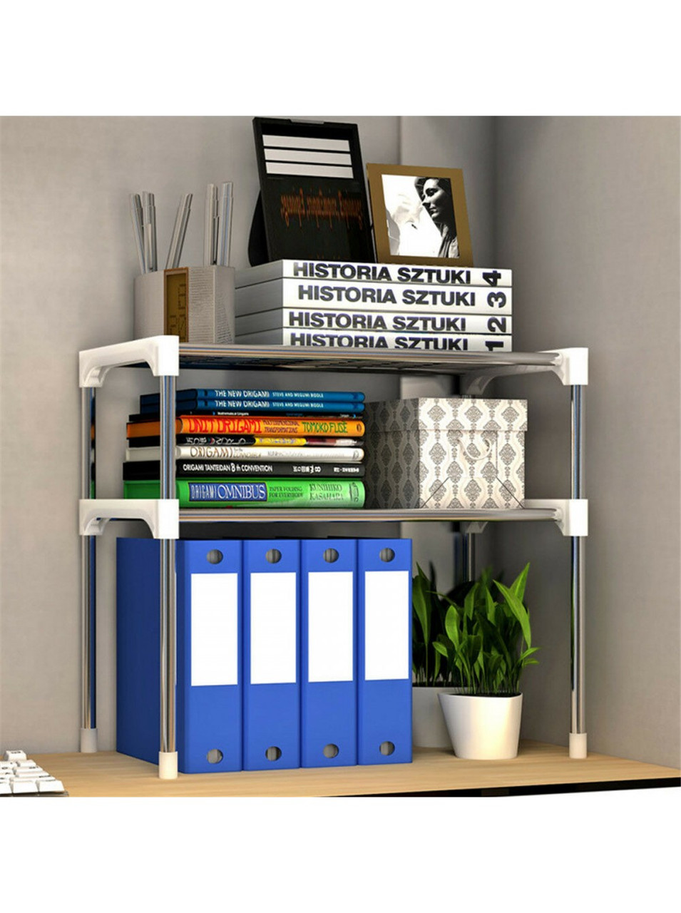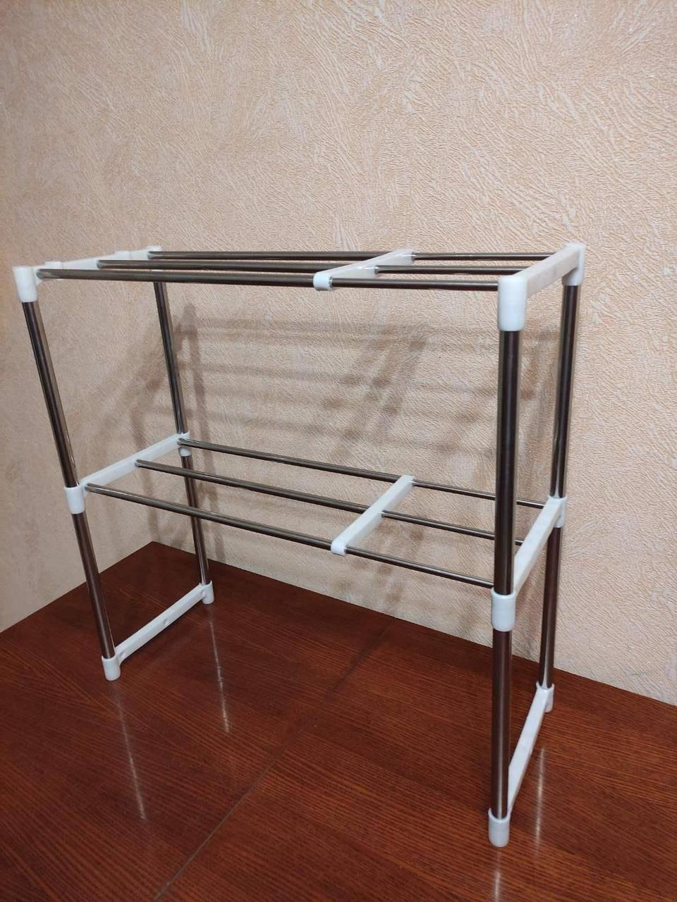 Міцний настільний стелаж для мікрохвильовки або іншої побутової техніки. Каркас виготовлений із металевих трубок, з’єднаних пластиковими кріпленнями. Решітчаста поверхня не накопичує пил і дуже проста в прибиранні.  Дві широкі полиці дадуть змогу залучити простір над НВЧ піччю та зручно розмістити там посуд, соуси та приправи та інші господарські дрібниці.